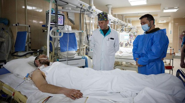 Di tengah gempuran Rusia ke Ukraina yang tak kunjung mereda, Presiden Volodymyr Zelensky melongok pasukannya yang terluka di rumah sakit.