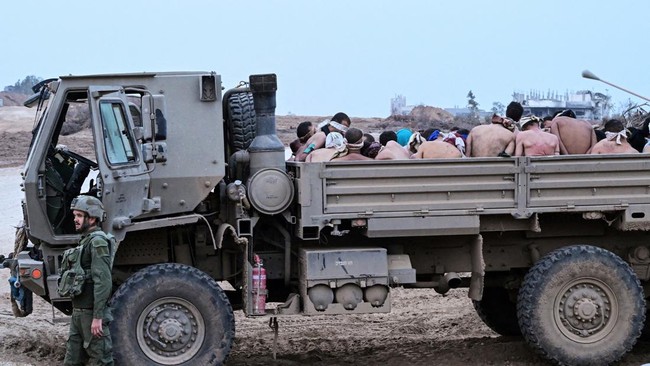 Sejumlah foto viral di media sosial, Kamis (7/12), yang menunjukkan puluhan pria di Gaza ditangkap hingga dilucuti pakaiannya oleh tentara Israel.
