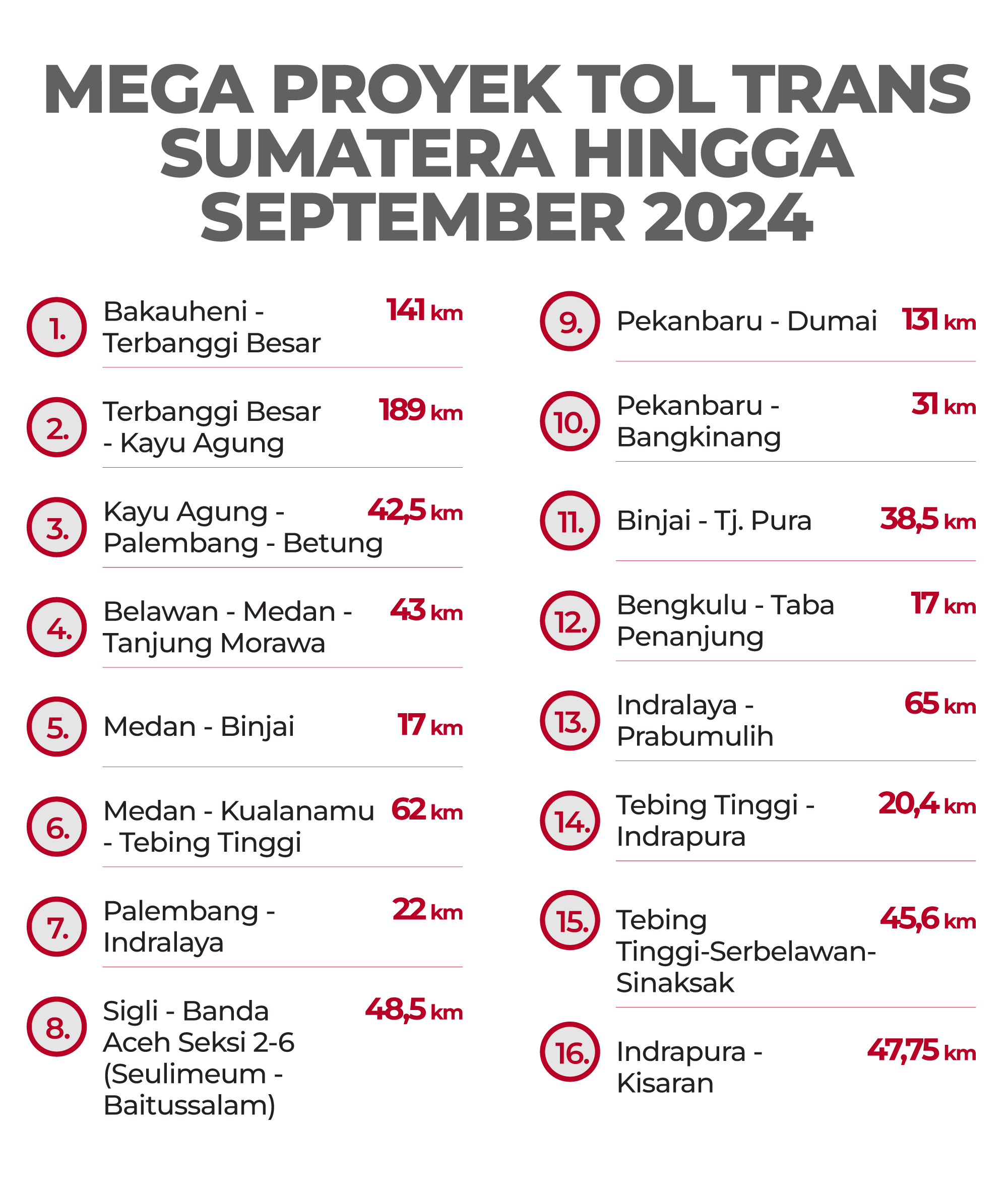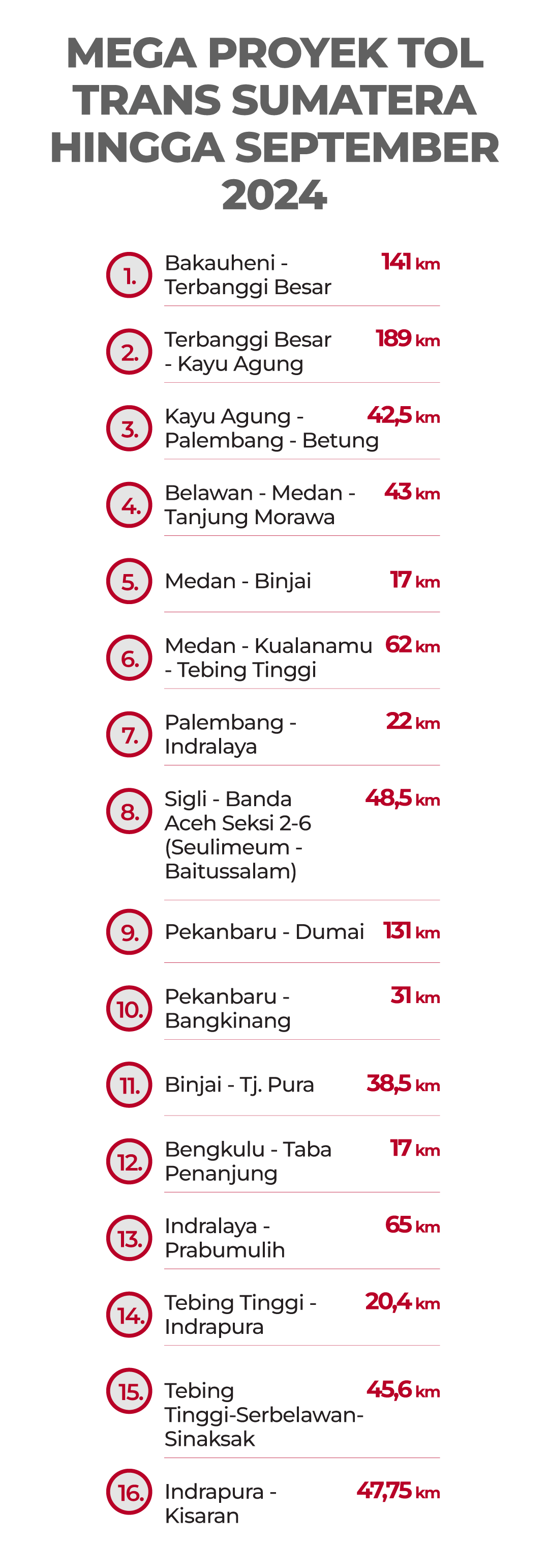 Total panjang Jalan Tol Trans Sumatera adalah 2.775 km dengan investasi sebesar Rp565 triliun. Pembangunan tahap pertama tol ini pun telah rampung pada Juni 2024.