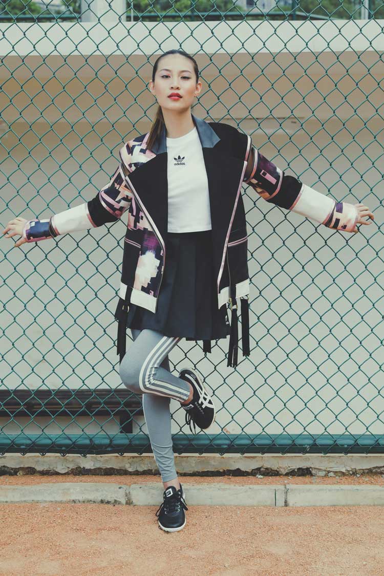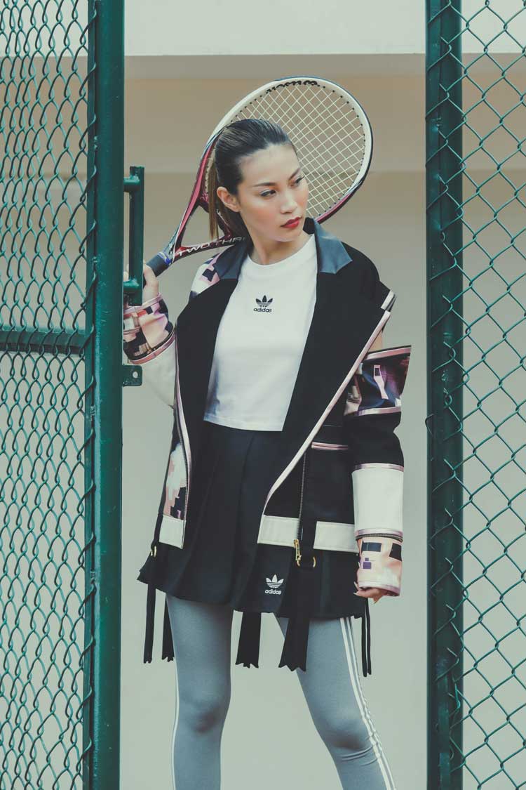 Fleksibilitas busana olahraga juga terlihat dari kemampuannya 'beradaptasi' dari gaya aktif menjadi flirty. Mini pleated skirt, crop top, dan cut out jacket menjadi kunci utamanya.