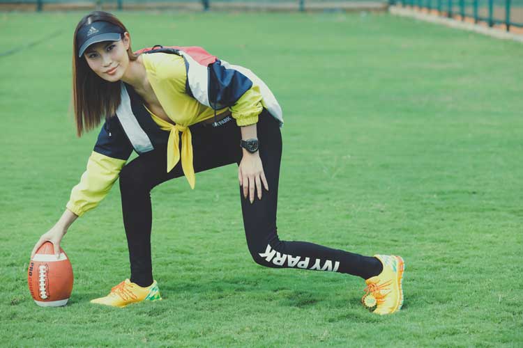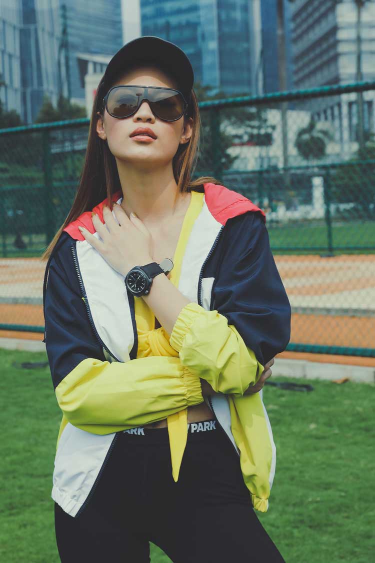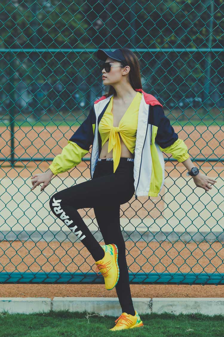 Siapa bilang kalau sporty look tak bisa terlihat seksi? Kombinasikan twisted crop top dengan garis leher rendah dengan legging dan jaket panel warna. Jangan lupa tambahkan sneakers, jam tangan, dan topi sebagai aksesori yang fashionably sporty.