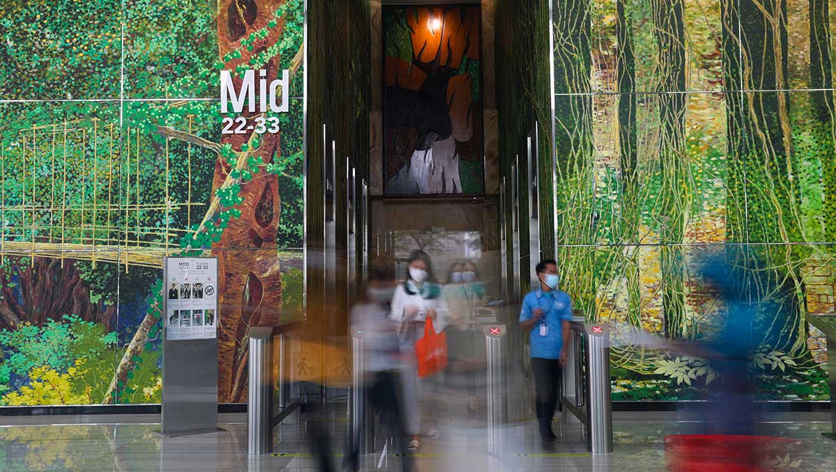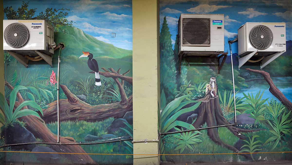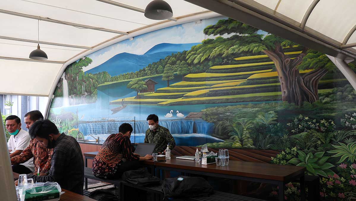 Bekerja dalam kekakuan ruangan tentu bisa melahirkan jiwa-jiwa yang jemu. Mural pemandangan alam coba mengambil alih kebosanan tersebut, menyegarkan mata dan menyulut semangat baru bagi pekerja.