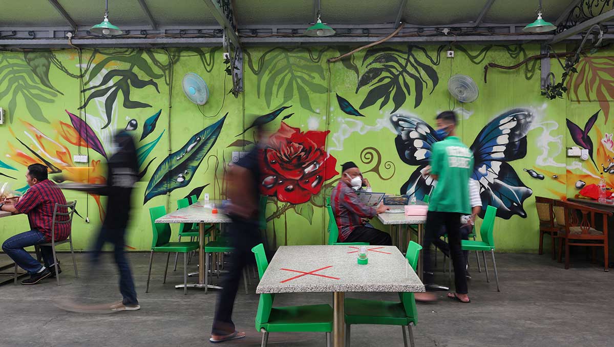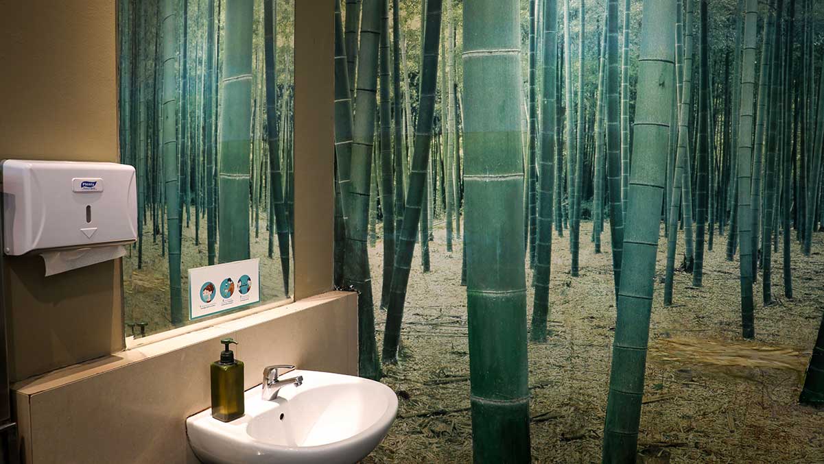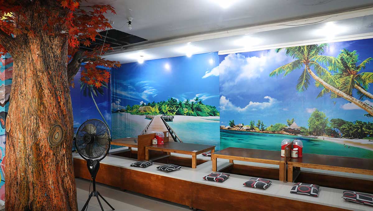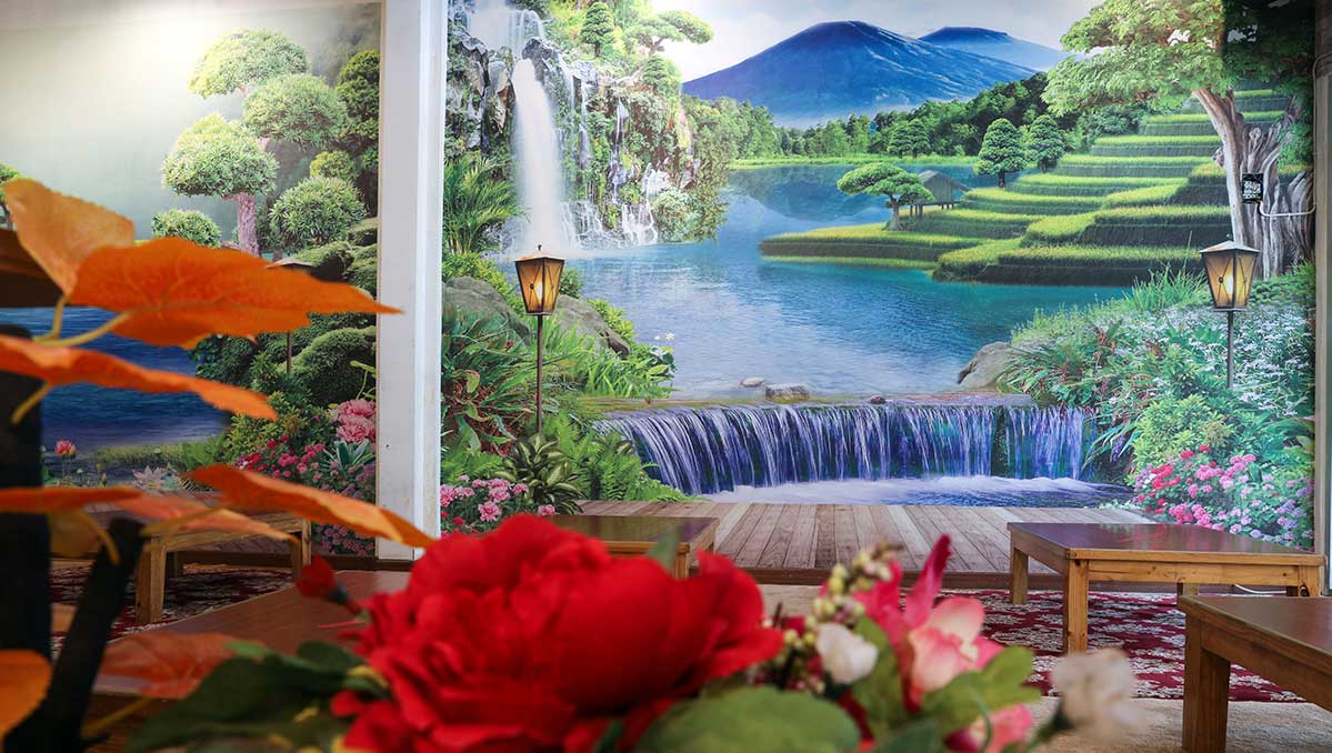 Di suatu ruang pusat jajan, wallpaper (gambar tembok) bambu mewakili sejuk dan desir angin.