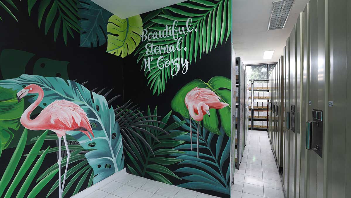 Aksen flamingo dan hijau dedaunan mengubah kekakuan pada ruang penyimpanan arsip sebuah kantor.