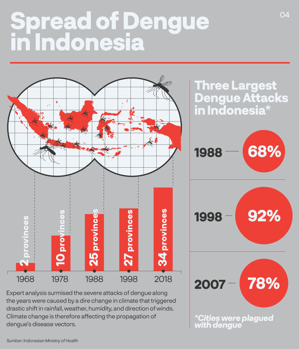When science shed more light on the disease a decade later, it was subsequently known as dengue, an infection inflicted by aedes mosquito bites during daylight. From a densely populated kampung in Surabaya, it soon travelled around the country.