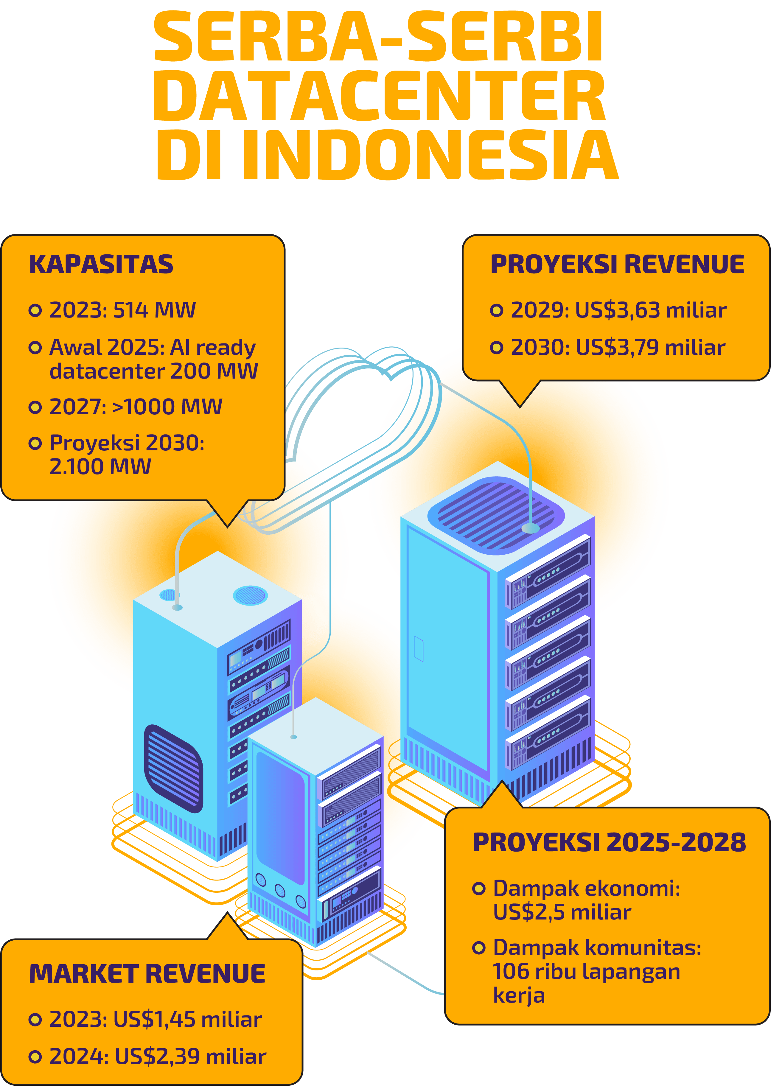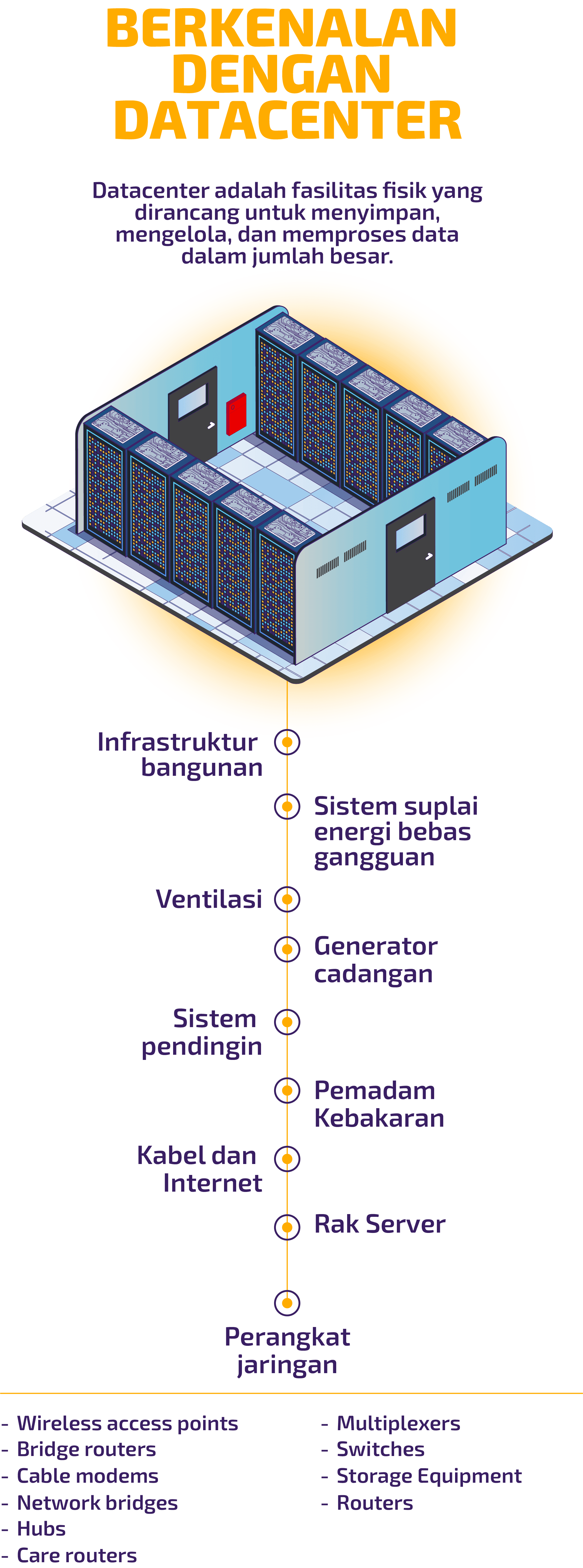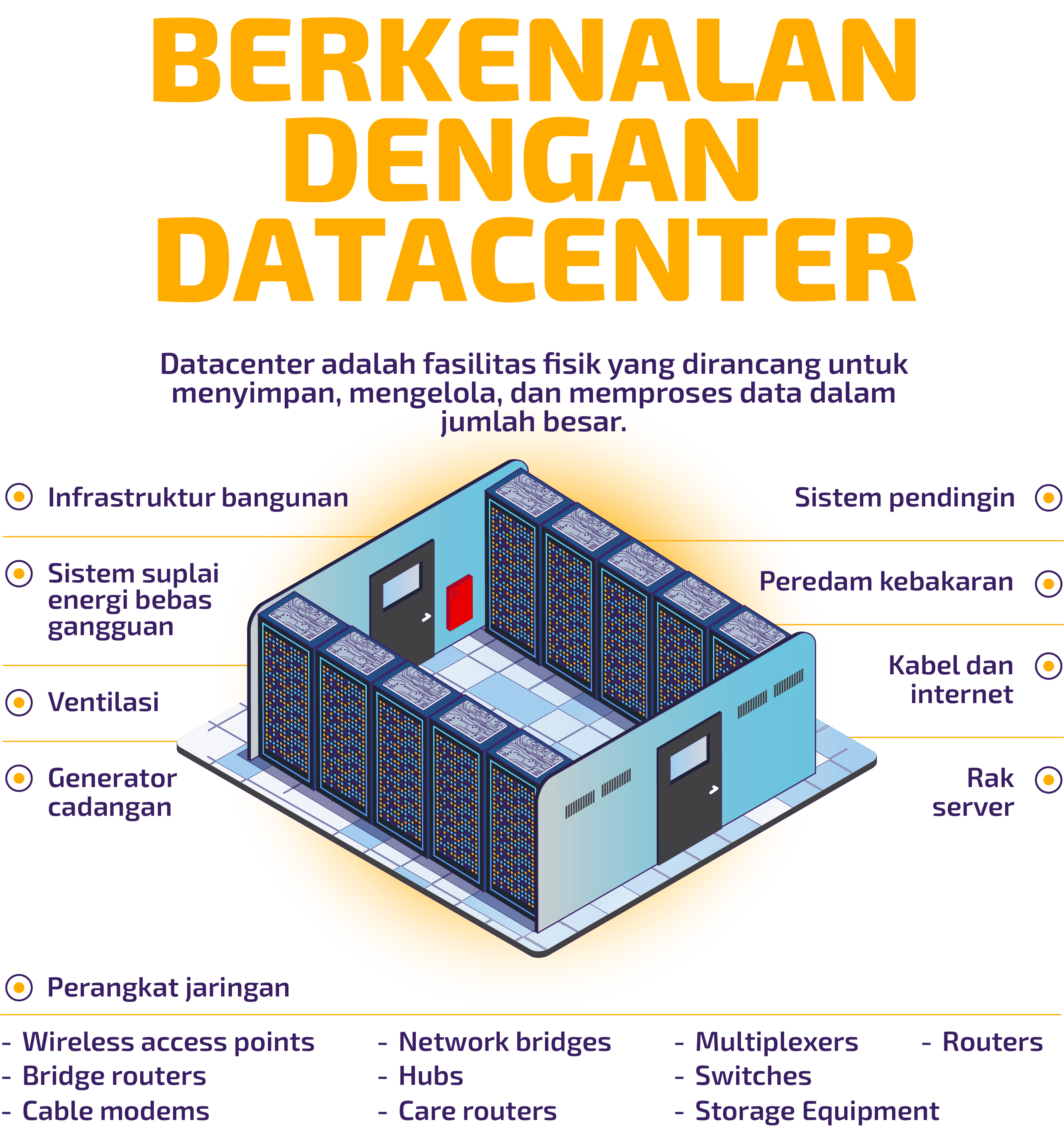 Secara sederhana, datacenter adalah ‘rak-rak’ atau fasilitas fisik yang disewakan kepada perusahaan yang ingin menyimpan dan mengelola data dalam jumlah besar. Semakin besar data set dan komputasinya, maka semakin besar pula kebutuhannya.