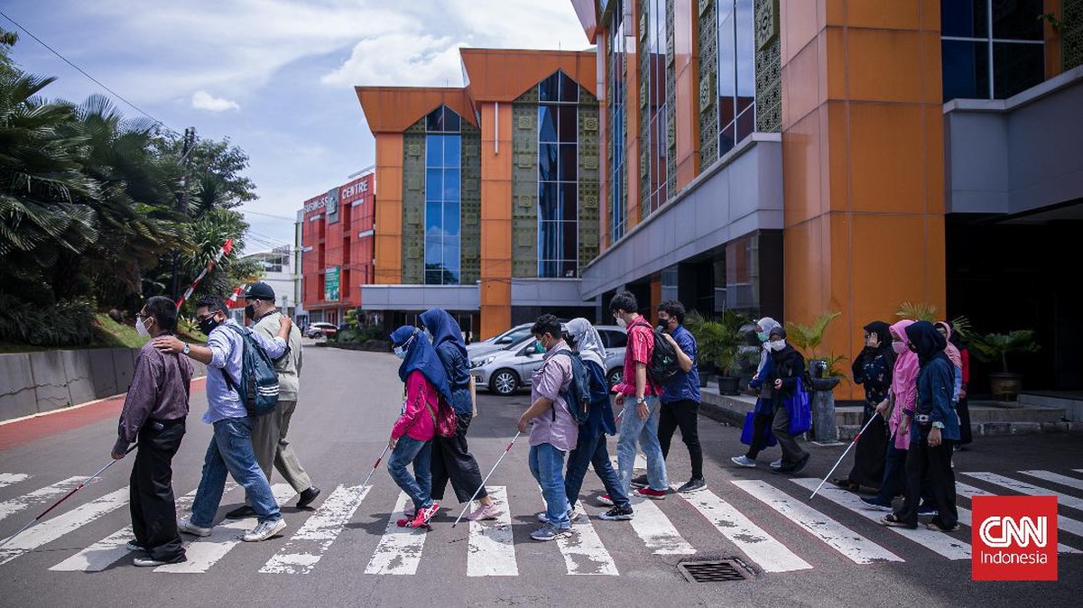 Sejumlah mahasiswa disabilitas tunanetra mengikuti masa orientasi mobilitas kampus di Universitas Muhamadiyah Jakarta (UMJ), Kamis (9/9).