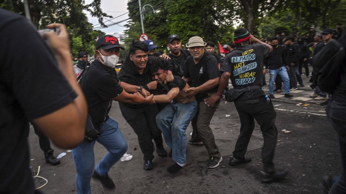 -- Puluhan orang diduga aparat kepolisian menangkap sejumlah peserta aksi tolak UU TNI di depan Gedung Negara Grahadi, Surabaya, Jawa Timur.