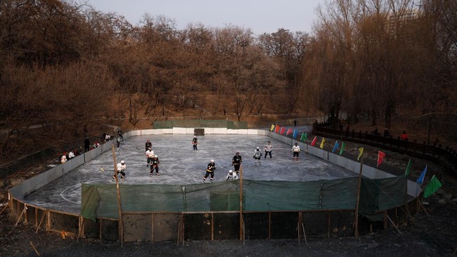 -- Di Anshan, China, terdapat sekelompok orang-orang paruh baya yang menikmati bermain hoki es di danau yang tengah membeku karena musim dingin.