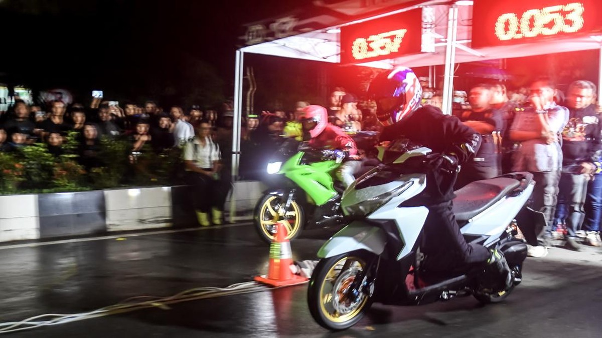 -- Adu kebut roda dua lintasan pendek alias drag race digelar malam hari di Samarinda, Kalimantan Timur, pada Minggu (16/3).